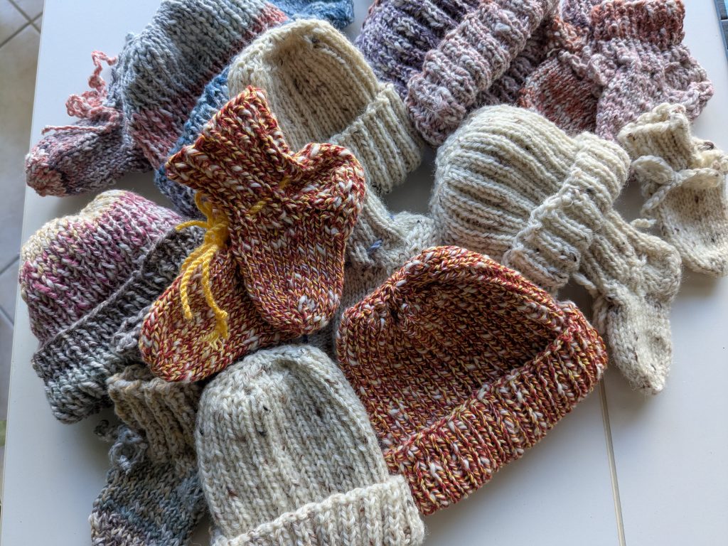In der Neonatologie der Kinderklinik Konstanz können Babys, die nach der 32. Schwangerschaftswoche zur Welt kommen und über 1500 Gramm wiegen, betreut und gepflegt werden, bis sie ihr Geburtsgewicht erreicht haben. Da sie noch sehr klein und zierlich sind findet man keine passenden Kleidungsstücke im Handel. Der Förderverein konnte eine 90-jährige Frau finden, die mit viel Herzblut kleine Mützen und Socken strickt. Sie freut sich in ihrem hohen Alter auf diese Weise etwas Gutes zu tun und jungen Eltern damit eine Hilfe zu sein. Sie spendet uns ihre Arbeitszeit und wir unterstützen sie, in dem die Wolle über Spendengelder finanziert wird. So können die Kleinsten in Ruhe bei den Eltern kuscheln und haben dabei stehts einen warmen Kopf und wohlig warme Füße.